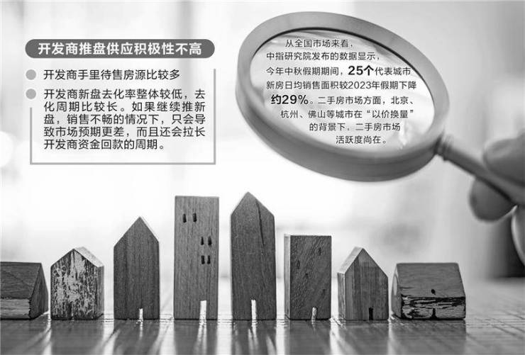 广东省住房政策研究中心研究员李宇嘉表示,“金九”期间,开发商推盘供应积极性不高,背后的主要原因在于开发商手里的待售房源比较多,另外,开发商新盘去化率整体也比较低,去化周期比较长。如果开发商仍然继续推新盘,销售不畅的情况下,只会导致市场预期更差,而且还会拉长开发商资金回款的周期。