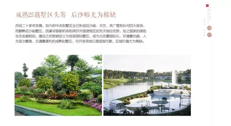 项目突出优势:地处中央别墅区后沙峪板块纯别墅社区,周边配套完善中粮祥云小镇,欧陆广场,荣祥广场,枫尚奥特莱斯,物美,永辉。 国际化教育氛围浓厚,项目北侧海嘉国际学校,鼎石国际学校等16所国际学校。中央别墅区不多在售的全新低密别墅社区,可以说这是入住中央别墅区最后的机会。