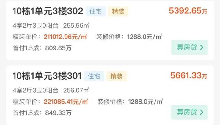 《每日经济新闻》记者注意到,其中一套建筑面积约256平方米的精装房源,单价达到了221085.41元/平方米,总价5661.33万元。