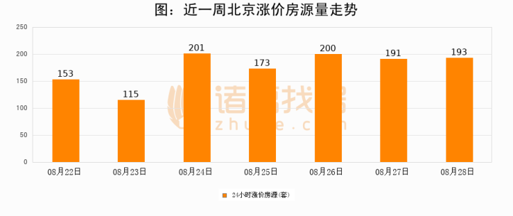 根据诸葛找房数据显示,北京24小时涨价房源量为193套,较08月27日增加2套,环比上涨1%。与此同时,涨价房源占比小幅扩大,业主信心有所提升。
