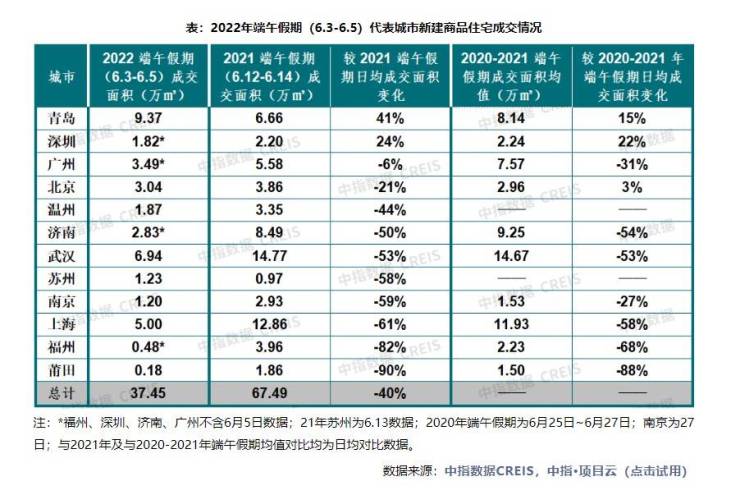 上海则受疫情影响,市场活跃度较低,端午期间,上海新建商品住宅成交面积5万平方米,同比下降61%。