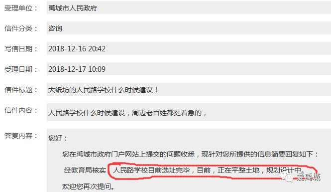 最近,有市民在禹城政府网上,问及:人民路学校到底什么时候建。答复为:经教育局核实,人民路学校目前选址完毕,目前,正在平整土地,规划设计中。