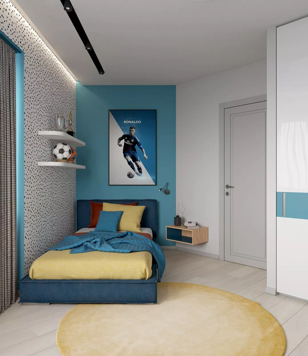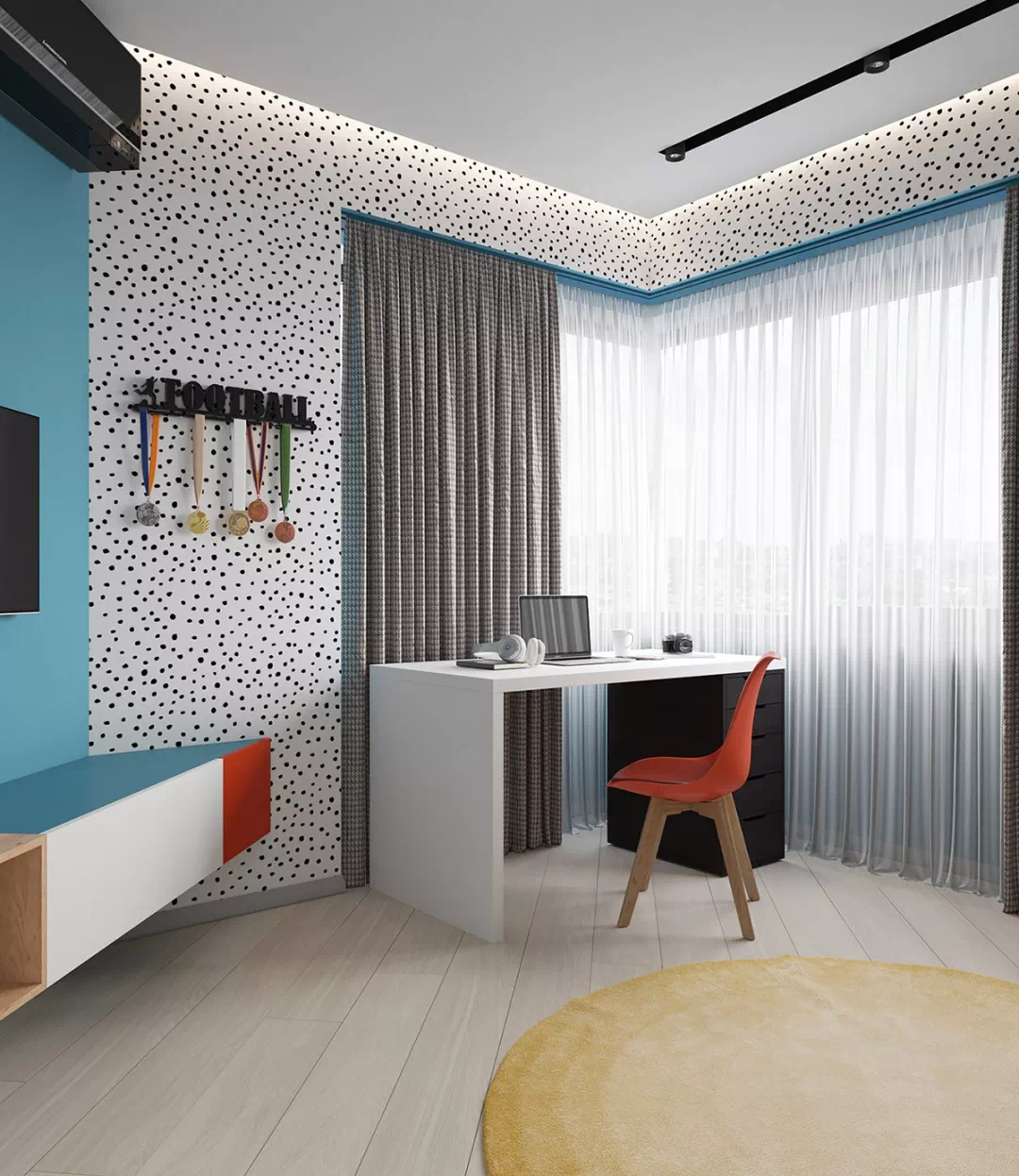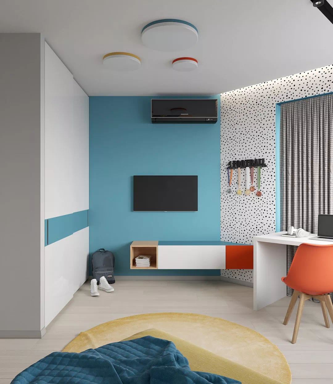 红色的办公椅在窗边,黄色的圆地毯在地板上看起来像阳光,这些都让空间更多了另一种明亮的感觉。电视的位置本是倒角,以适应不寻常的房间形状。蓝色的墙漆涂成的电视墙,在白色的衣柜上,这种颜色就像一条条纹。