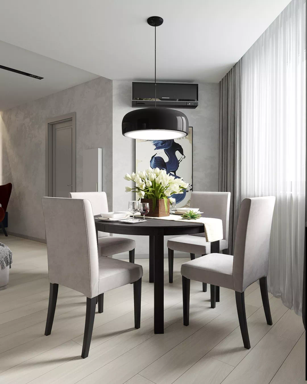 在这里还可以看到一个非常简约时尚的餐厅吊灯,其造型与桌子的圆形相呼应,漂亮的花篮与闪闪发光的酒杯,装饰着一张黑色的餐桌,设计师还利用一套白色的桌椅,来截断吊灯与餐桌的深色呼应,同时用现代艺术品为单色厨餐厅增加色彩,让空间显现出时尚的魅力。