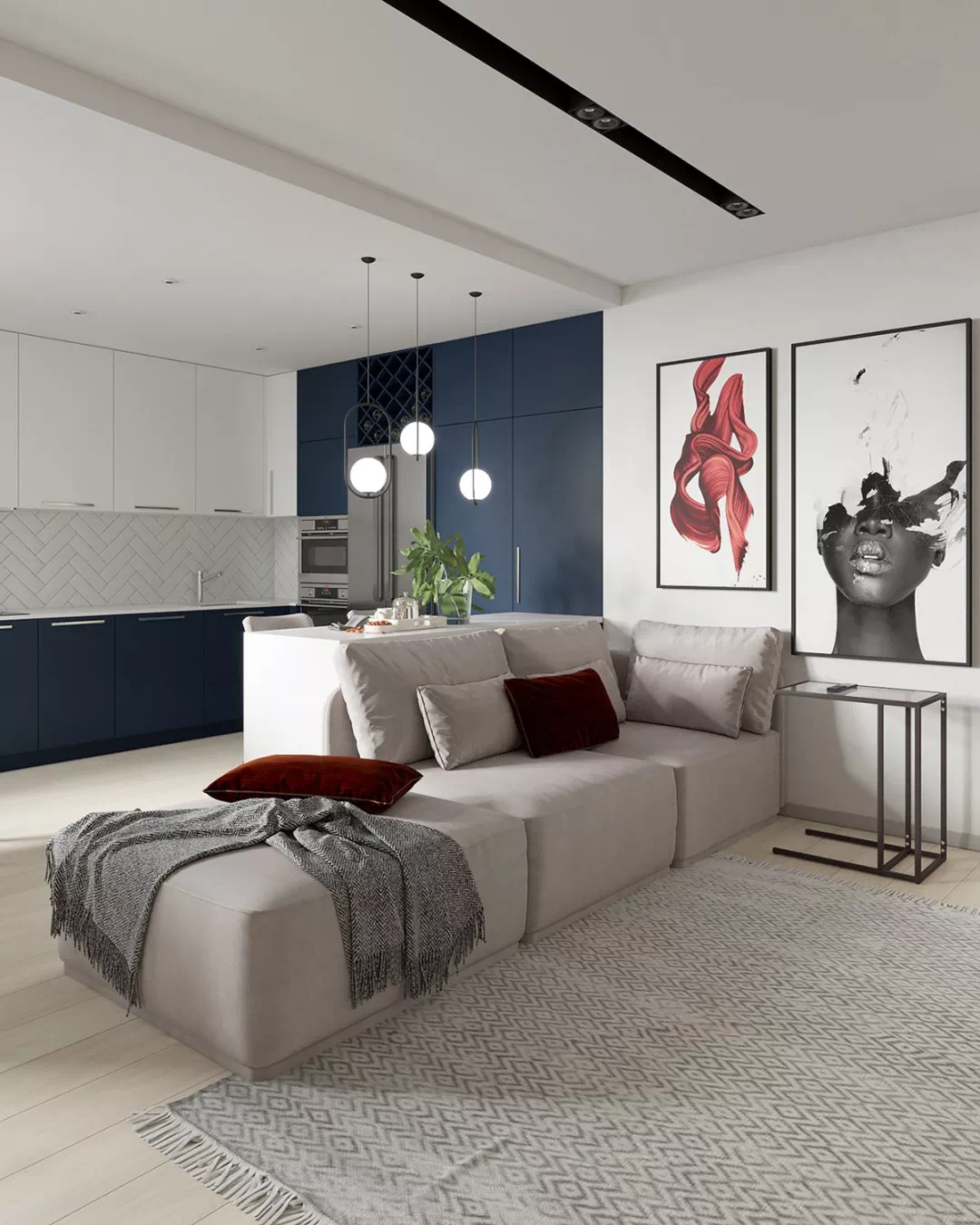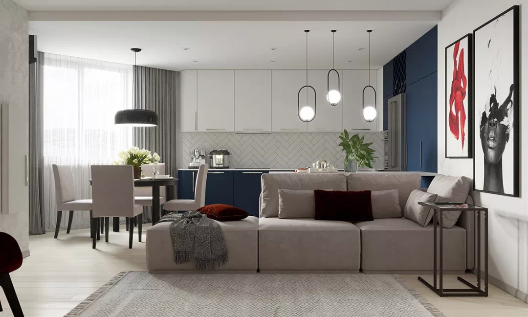 客厅使用了当下超火的模块化、带有浅褐色软垫的现代沙发,将开放式厨房和客厅一分为二,两个天鹅绒般的红色靠垫点亮座位,与墙上的艺术画作在色彩和质感的视觉效果上都有所呼应,调动出人们积极向上的生活力量,更为空间增添一抹柔美的气质。