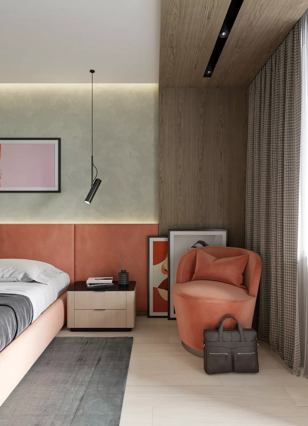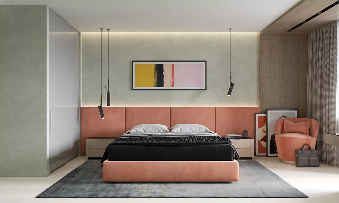 在这间现代化的卧室里,桃色的图案起到了起承转合的作用。桃色织物床架和超大床头板占据了整个房间视觉焦点,与现代墙壁艺术的色调相得益彰。细长的卧室吊灯在设计师选择黑色装饰时脱颖而出,以抵消桃色调色板的甜味,辅以黑色和灰色的床品,有助于达到视觉的平衡。
