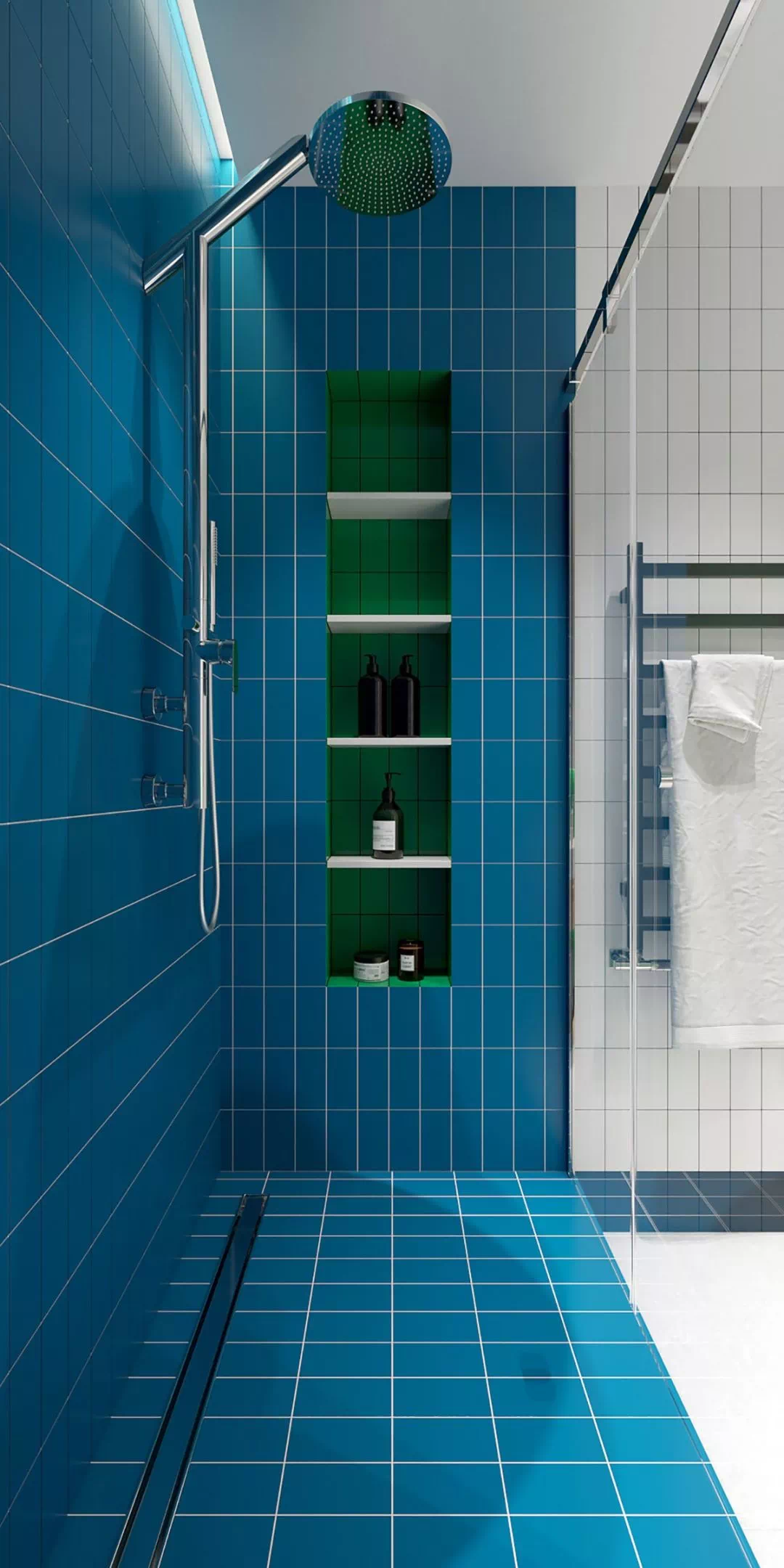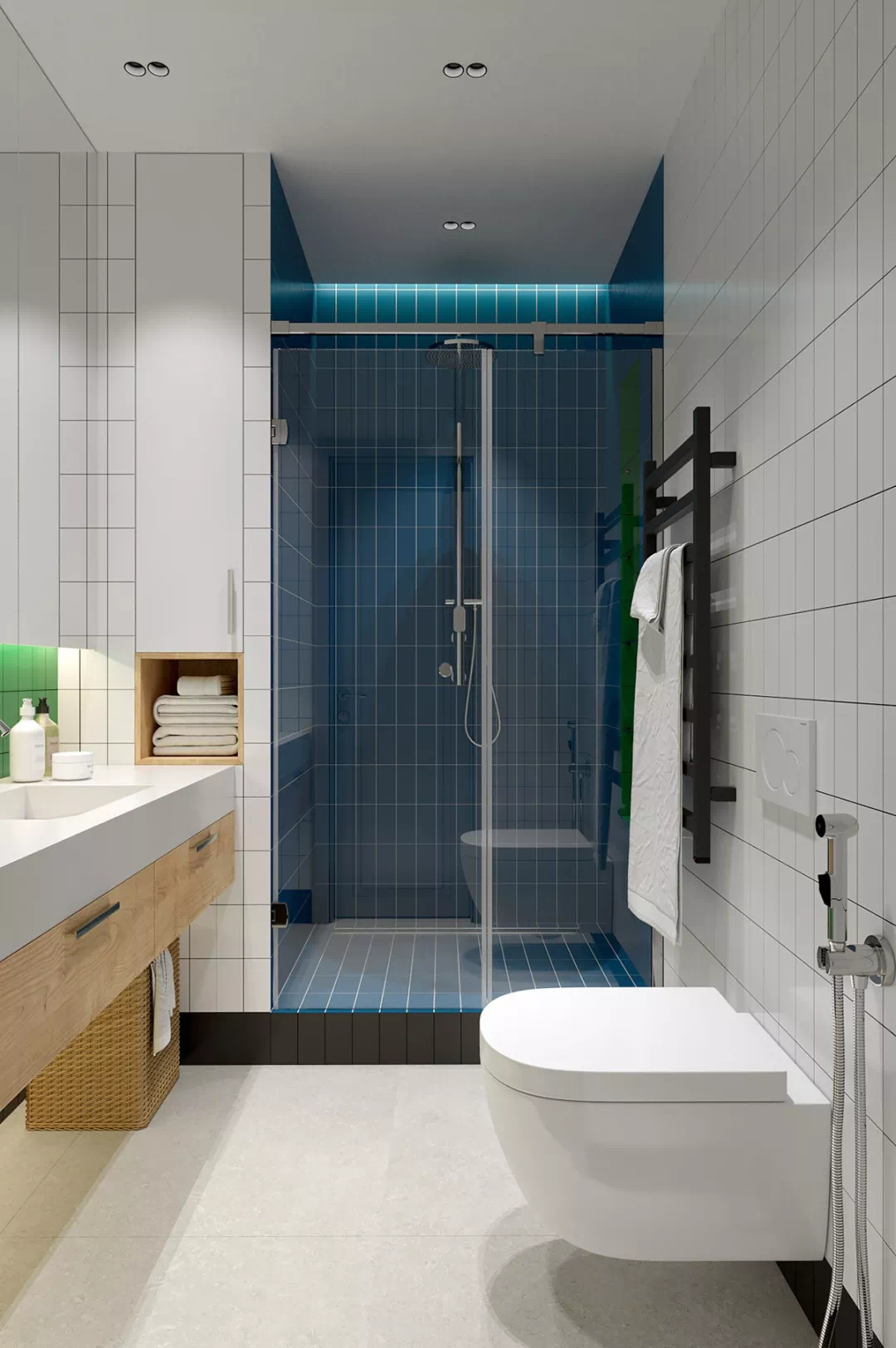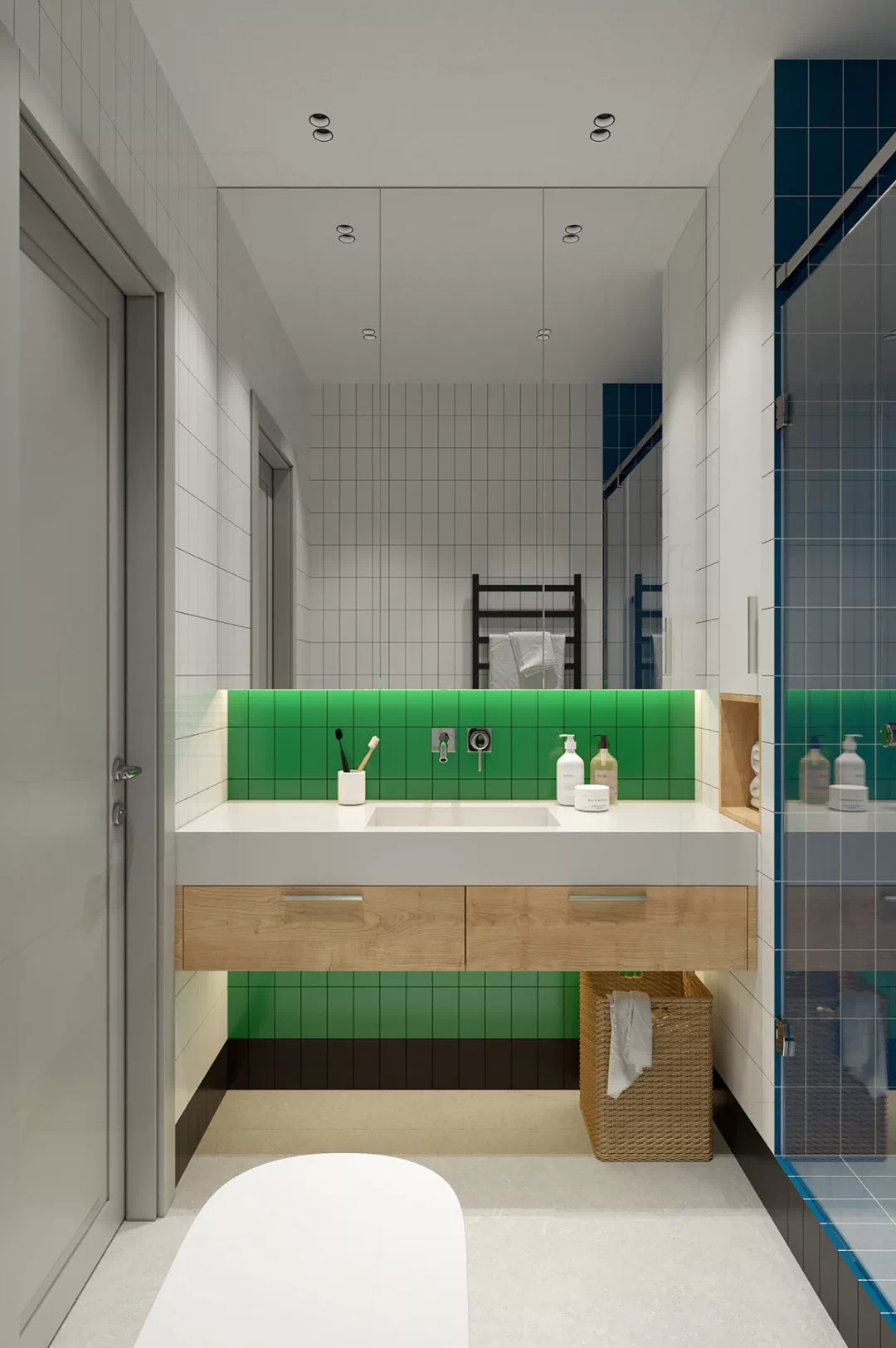 儿童浴室的装饰是绿色、白色和蓝色瓷砖部分的组合,天然木色调和藤条的感觉,有助于中和活泼的氛围,让空间变得更加自然稳妥。淋浴间的壁龛使用铺贴绿色瓷砖,而蓝色瓷砖则覆盖了淋浴间的其余部分。白色的架子划破了颜色,使外观感受焕然一新。
