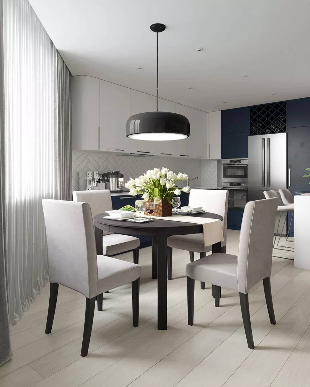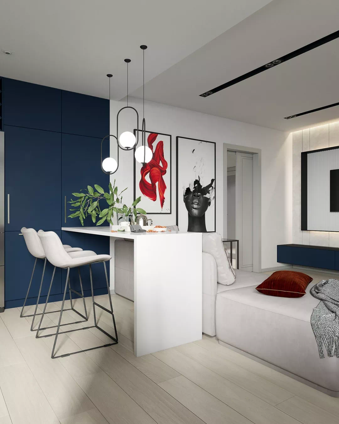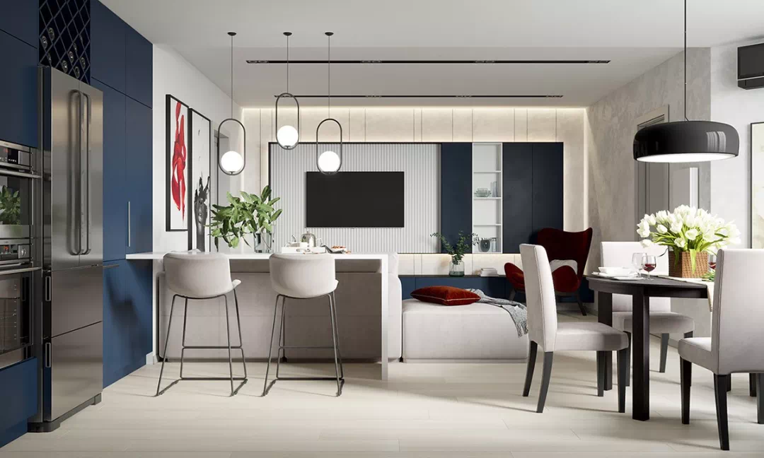 厨房半岛延伸到客厅沙发后面,配有两个酒吧凳子,以供休闲用餐和观看电视,不仅可以简单就餐,而且家人还可以在此进行情感的交流。沿着早餐吧或咖啡吧的长度,悬挂着三个吊灯,既满足照明的实用功能,也可以满足审美的需求。
