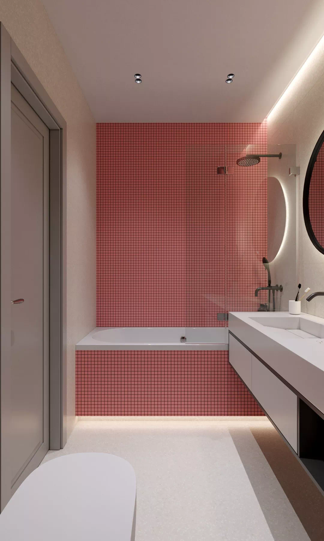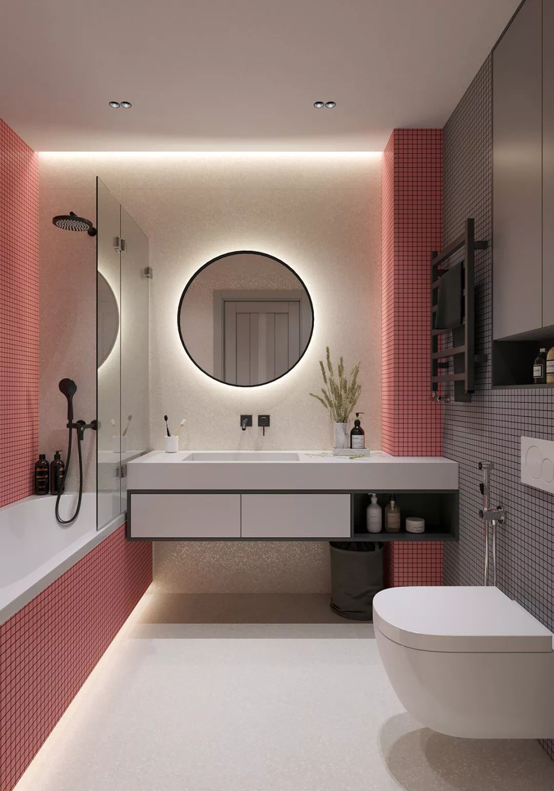 卫生间干湿分离越来越被人们所接受,干燥、卫生,缓解家里早晚高峰的使用压力,可以给人带来便利、舒适的感觉。主卫空间以黑色为主基调,利用珊瑚色和灰色装饰覆盖主浴室,通过双色调的瓷砖进行装饰。在造型上,现代的浴室梳妆台是单色线性的设计,配合一个圆形的发光镜,整体空间既柔美又优雅稳重。