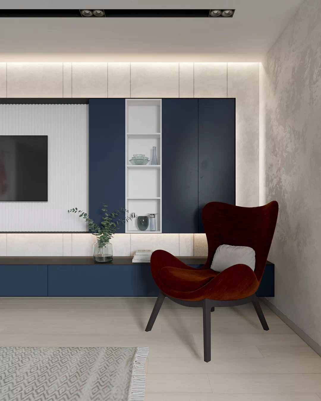 客厅空间的点睛之笔是一把深红色的椅子,它在蓝色电视柜的衬托下,成为一个充满时尚张力的休闲之处,给人以遐想静思的空间。平板电视被安置在与房间白色墙壁相匹配的白色面板中央,给空间带来更多生动的感觉。