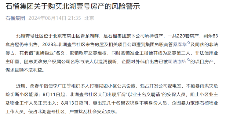 8月14日晚,石榴集团官微发布《关于购买北湖壹号房产的风险警示》(以下简称《警示》)称,2023年北湖壹号社区未售房屋及相关项目公司遭到集团免职高管桑春华及同伙的非法侵占,其假借“更换物业”名义,非法使用业主印章,随意更改房产权属公司名称与法人以混淆视听,企图对外低价出售已被司法冻结的项目房产,谋求巨额不法利益。