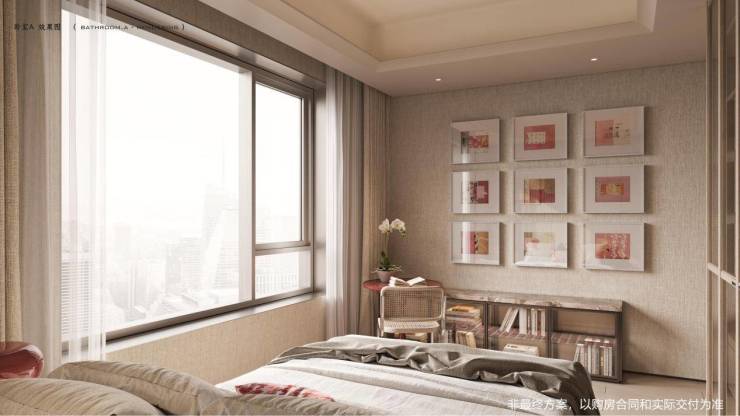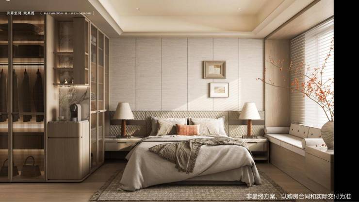 另一个南向套房同样令人惊艳。它不仅拥有阔绰的衣帽间和独立卫生间,还配备了专属飘窗空间。这种设计不仅提升了次主卧的实用性,更体现了项目方在户型设计上的用心与极致追求。