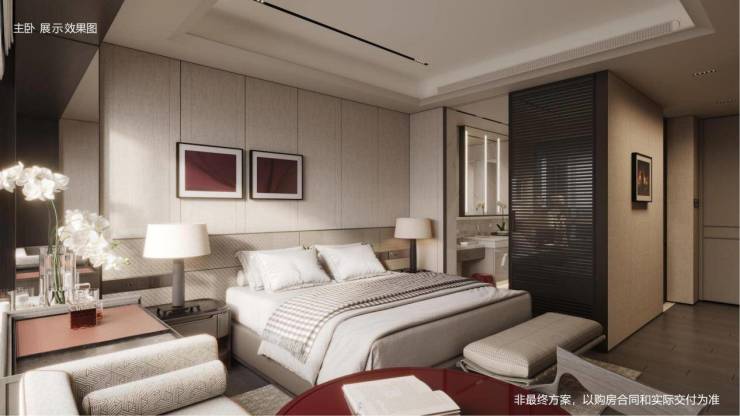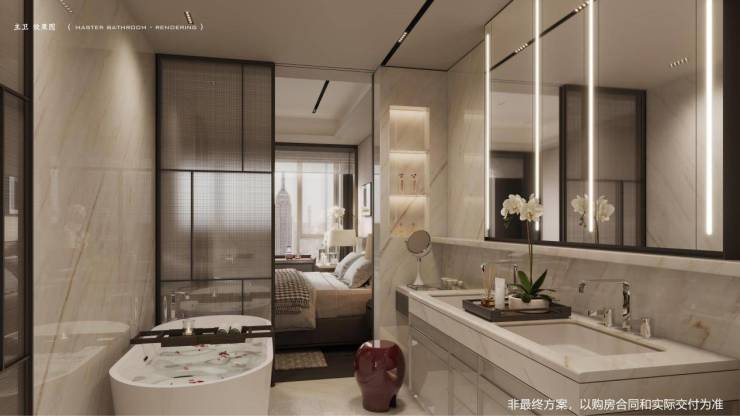 重点说说主卧,这个户型的主卧套房直接满配,光是空间就已经是更高“尊贵”级别的存在。独立衣帽间、三分离卫浴、双台盆、浴缸一应俱全,飘窗还可以打造成休憩区,让男女主人享受度假酒店套房般的氛围空间。