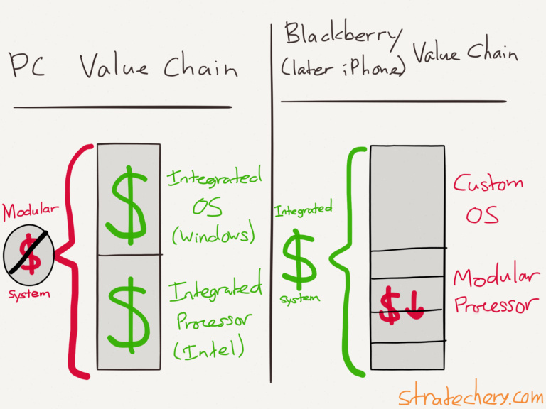 PC是一个模块化的系统,其集成部件可以获得全部利润。另一方面,黑莓(以及后来的iPhone )是一个使用模块化部件的集成系统。请注意,这是一个非常简化的示例。