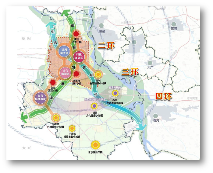 新三环外地区主要包括马驹桥、于家务、永乐店、大厂县城、三河、香河等地区,这些地区主要将自给自足,承担相应的功能和人口。