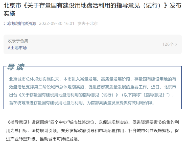9月30日,北京市规划和自然资源委员会官方微信显示,北京市《关于存量国有建设用地盘活利用的指导意见(试行)》(下称《指导意见》)发布实施,旨在统筹推进存量国有建设用地盘活利用,为首都高质量发展提供有效用地保障。