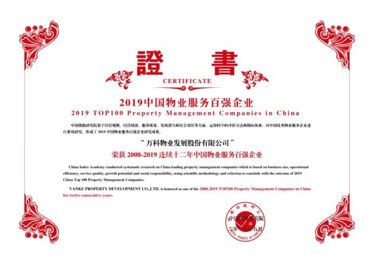 5月24日,由中国指数研究院、中国房地产TOP10研究组共同主办的“2019中国物业服务企业百强研究成果发布会暨第十二届中国物业服务企业家峰会”在北京隆重举行。会上,万科物业作为中国物业管理行业的领跑者,荣获2019中国物业服务百强企业排名前列名,这是万科物业第10年蝉联百强榜首。同时,万科物业连续第3年荣获“中国特色物业服务先进企业——企业总部基地”荣誉称号。