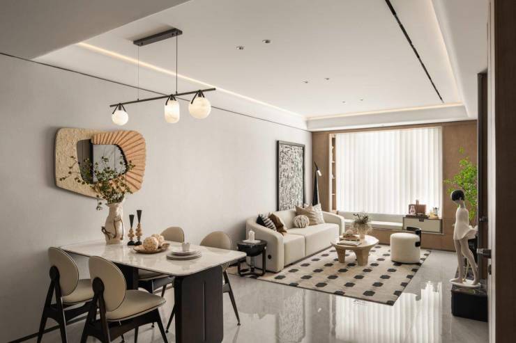 在餐厅区域,中建星光里建面约96㎡三居通过设计一体化餐边柜系统,进一步提升了收纳功能。餐边柜以高颜值与强收纳并存为特点,通过柜体+展示柜的组合形式,增强了储物能力,赋予餐边柜更多的展示功能,进一步拉满餐厅整体的格调与品位。