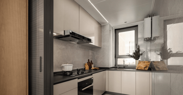 厨房作为家庭生活的一大功能区,储纳与美观在这里得到了更好地体现。建面约96㎡三居的L型厨房,依循科学的动线原则,更大化利用空间,满足了清洗、烹饪、储物和操作的多重需求。橱柜与吊柜的组合设计,分区明确,让锅具、电器、调料等物品得以有序归置。吊柜的可视化创意设计让物品一目了然,便于日常存取。