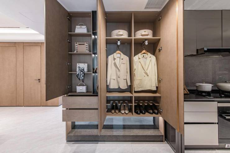 玄关作为家庭的第一道风景,其设计直接影响到居住的便利与美观性。玄关采用贴墙柜体式大容量收纳柜,鞋子、包包、雨伞等日常物品都能妥善安置。柜体内部的分区设计细致合理,多样化储纳空间,确保了日常物品的易取性。独立玄关配置增强了空间的整体感,提升了生活的舒适度,营造从容步履的归家礼序。