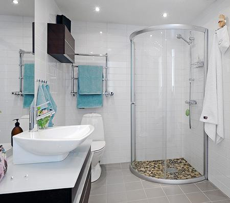 为了不让空间显得太过单调,也更好的区分干湿分离区,淋浴区的地面选择了不同样式的地面砖,十分个性。同时还可以加入颜色鲜艳的洗漱用品给卫生间添色,如毛巾、牙杯等。