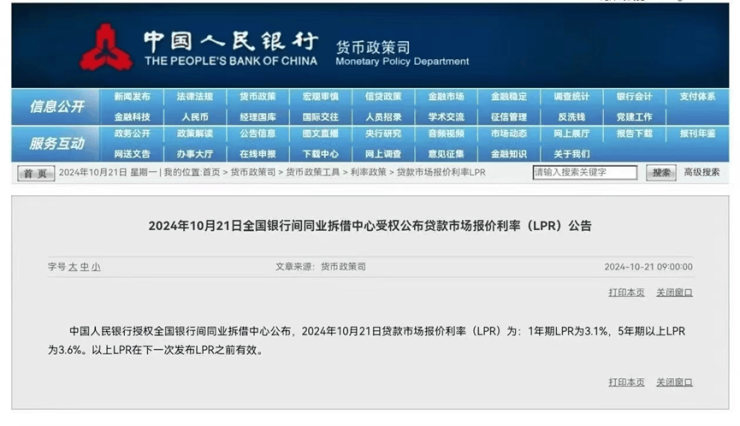 据央视新闻,中国人民银行授权全国银行间同业拆借中心公布,2024年10月21日贷款市场报价利率(LPR)为:1年期LPR为3.10%,5年期以上LPR为3.60%,均较此前下降0.25个百分点。这是今年以来LPR第三次下降,也是降幅最大的一次,北京的首套房贷利率降到了3.15%的历史最低值,二套房贷最低利率也达到了3.35%,同样是历史最低。