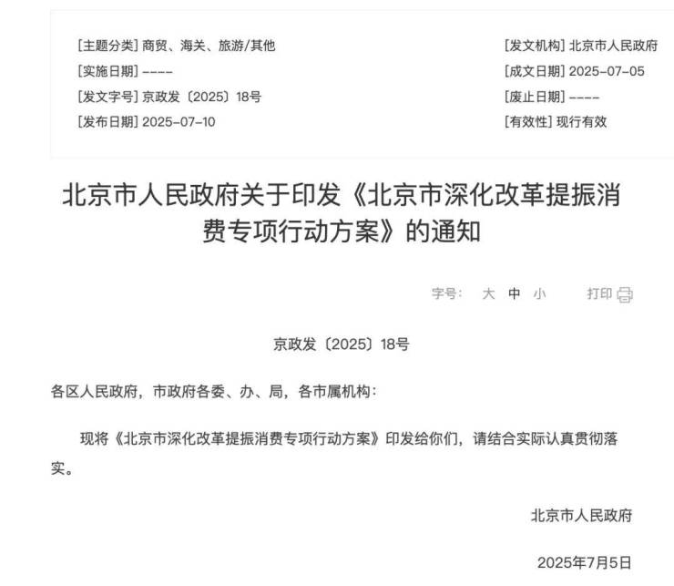 北京市政府正式印发《北京市深化改革提振消费专项行动方案》,