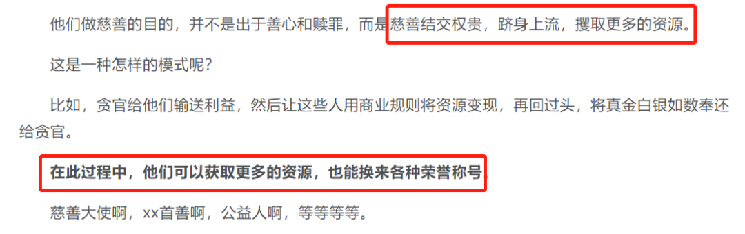 您可以留意一下,早年间慈善富豪榜的座上宾们,不难发现现在他们都进去了。就知道这帮做慈善的企业家没那么简单,捐钱越多,他们越富。