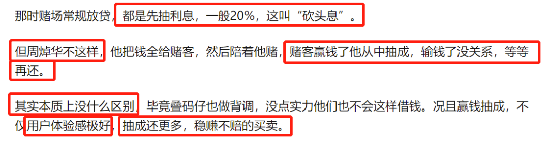 排名前列就是业务创新。赌客要是借钱,他一分利息不谈痛痛快快就给,输钱了不着急还;要是赢了,赌客开开心心就给了抽成,还有兴致继续赌下去。