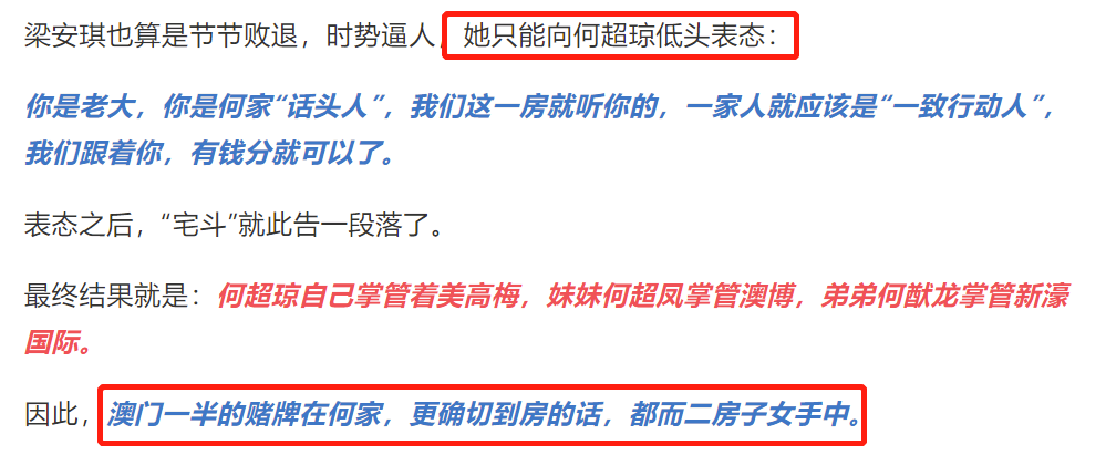然而二房长女何超琼不愧是何老爷子钦定的接班人。在拉拢了霍震霆之后,二房完全独占了何家的话语权。
