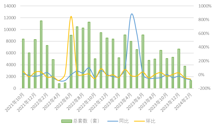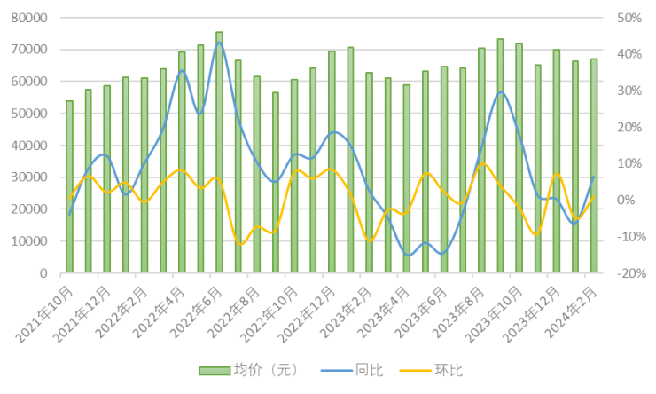 此外,2月份成交的套均总价为816万元/套,环比增长7%,同比增长20%;成交均价66957元/平方米,环比增长1%,同比增长7%。