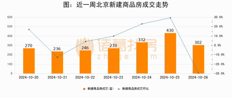 根据北京市住房和城乡建设委员会数据显示,2024年10月26日北京新建商品房成交302套,较昨日减少128套,环比下降29.8%