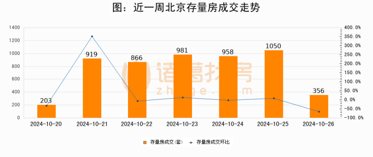 从存量房来看,2024年10月26日北京存量房单日成交356套,比昨日减少694套,环比下降66.1%。从近一周存量房成交来看,北京存量房日均成交套数为761套,10月26日单日成交356套,低于近一周平均水平53.2%。