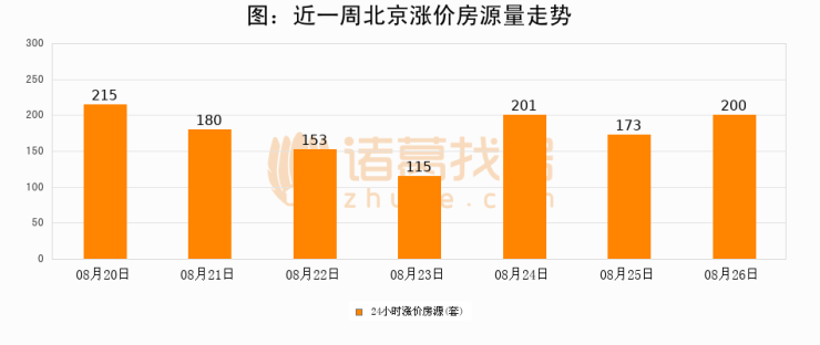 根据诸葛找房数据显示,北京24小时涨价房源量为200套,较08月25日增加27套,环比上涨15.6%。与此同时,涨价房源占比小幅扩大,业主信心有所提升。