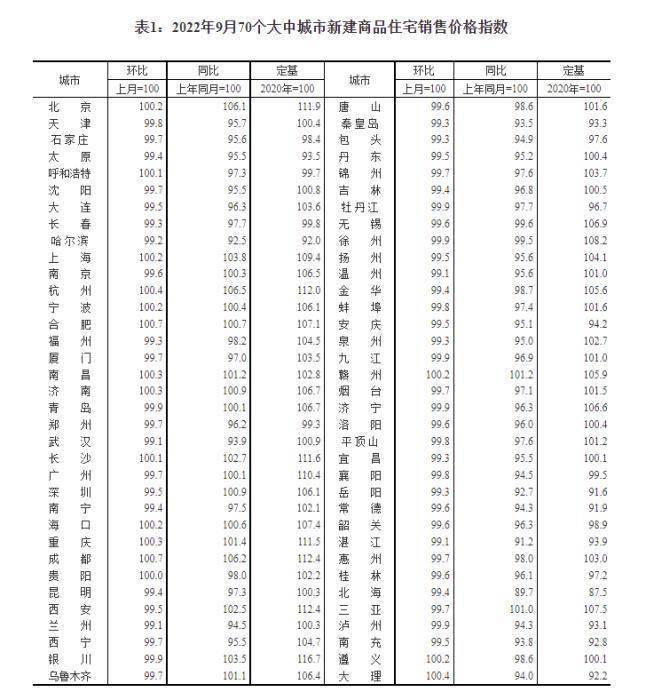 2022年9月70个大中城市新建商品住宅销售价格指数。截图自国家统计局官网