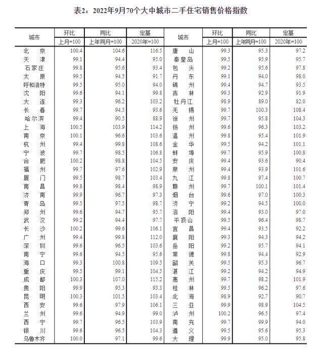 2022年9月70个大中城市二手住宅销售价格指数。截图自国家统计局官网