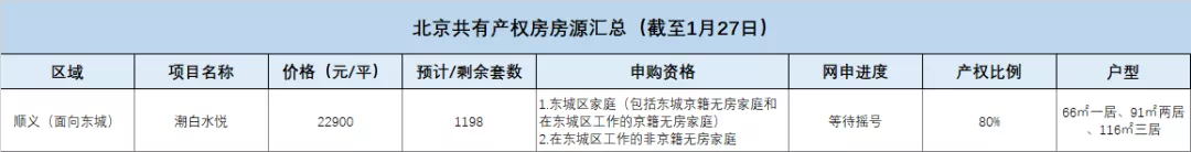 01 顺义(面向东城)顺义目前只有一个共产房项目,位于顺义新城的仁和板块的潮白水悦,销售均价22900元/平米,首次网申提供1198套房源,面向东城区户籍和工作的家庭网上申购登记。前段时间因为需要进一步核实资质延迟了摇号时间,希望年后能顺利进行下去吧。