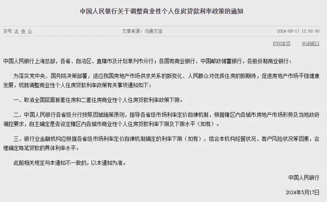 5月17日,中国人民银行、国家金融监督管理总局发布关于调整个人住房贷款最低首付款比例政策的通知,为落实党中央、国务院决策部署,适应我国房地产市场供求关系的新变化、人民群众对优质住房的新期待,促进房地产市场平稳健康发展,现就个人住房贷款政策有关事项通知如下: