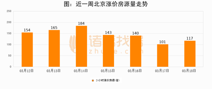 根据诸葛找房数据显示,北京24小时涨价房源量为117套,较03月17日增加16套,环比上涨15.8%。与此同时,涨价房源占比小幅扩大,业主信心有所提升。
