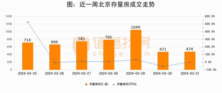从存量房来看,2024年03月31日北京存量房单日成交474套,比昨日增加3套,环比上涨0.6%。从近一周存量房成交来看,北京存量房日均成交套数为700套,03月31日单日成交474套,低于近一周平均水平32.3%。