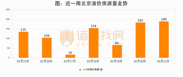 根据诸葛找房数据显示,北京24小时涨价房源量为189套,较03月30日增加6套,环比上涨3.3%。与此同时,涨价房源占比小幅扩大,业主信心有所提升。