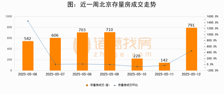 从存量房来看,2025年05月12日北京存量房单日成交791套,比昨日增加649套,环比上涨457%。从近一周存量房成交来看,北京存量房日均成交套数为530套,05月12日单日成交791套,高于近一周平均水平49.2%。