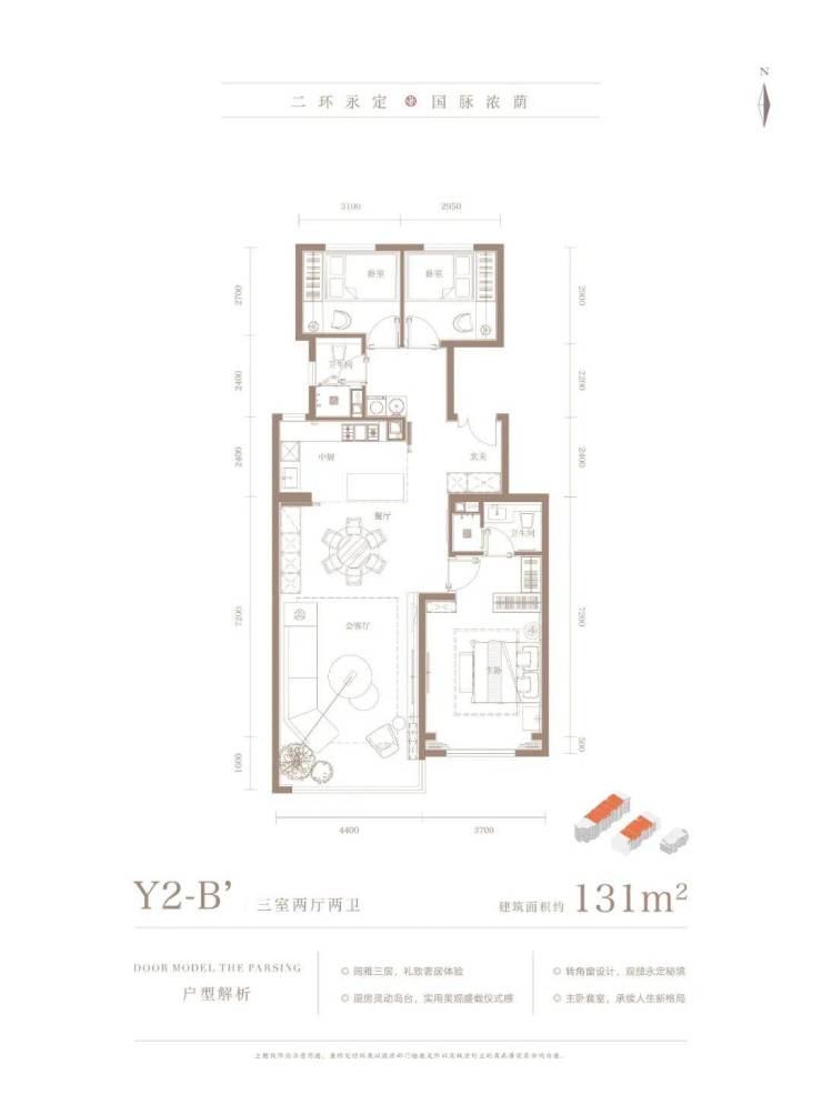 131㎡三居两卫,南向两面宽,客厅面宽4.4米,270拐角幕景,LDK一体化设计;主卧面宽3.7米,套房设计;北向两次卧略小,均不到9平米。