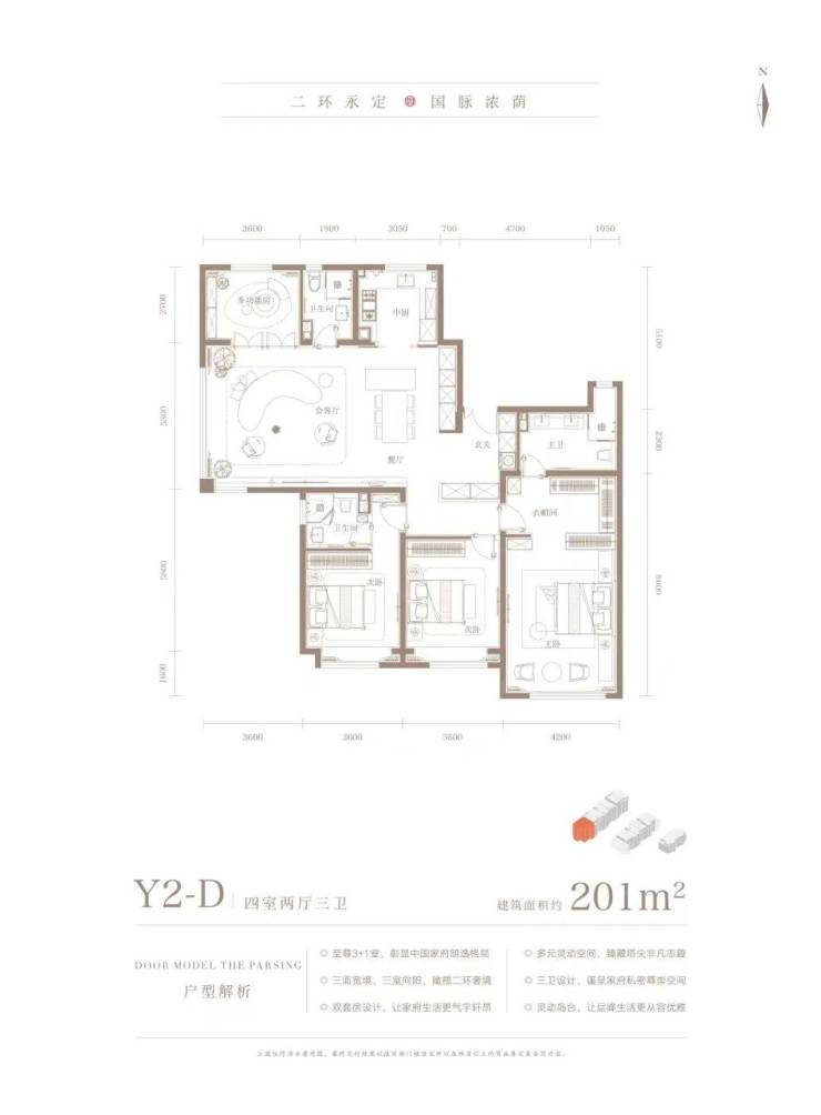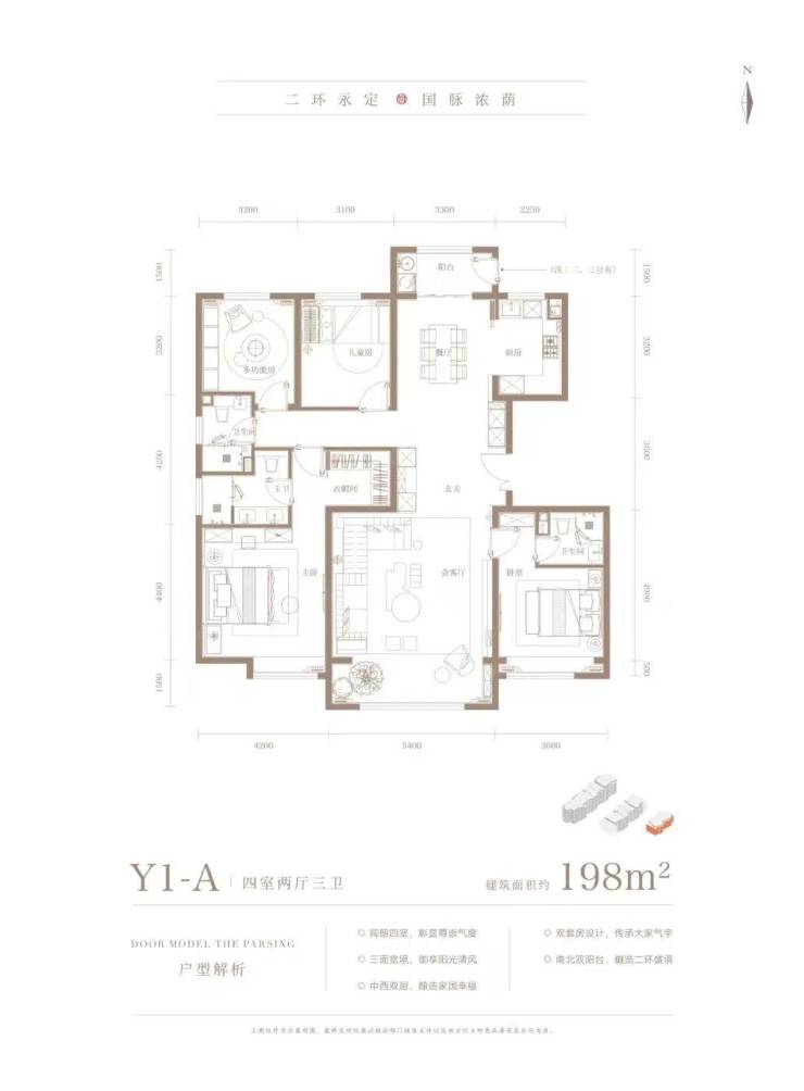 198㎡四居三卫,南向三面宽,客厅面宽5.4米,南向双套房设计;主卧面宽4.2米,带有衣帽间,主卫双台盆;
