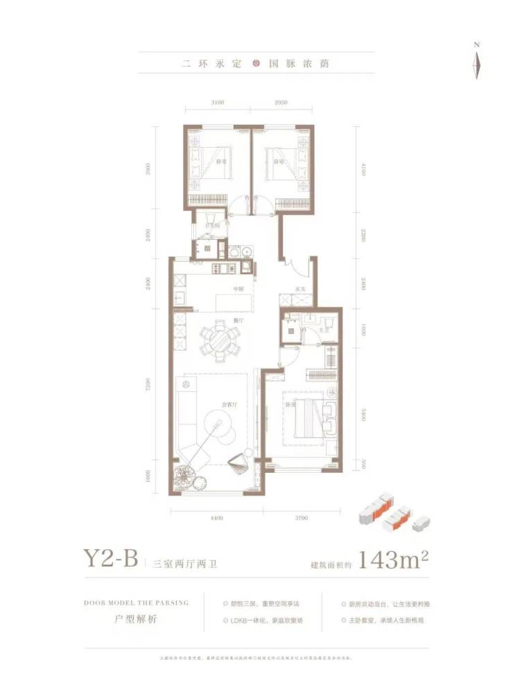 143㎡三居双卫,格局和131平户型一样,区别在于北向次卧空间更大些。