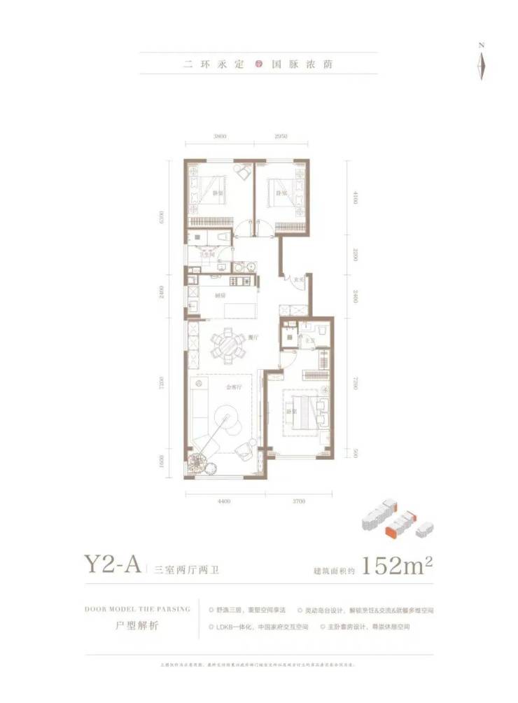 152㎡三居双卫,客厅面宽4.4米,LDK一体化设计,并且这个户型餐厅及厨房朝西开了窗,采光效果更好;次卫面积也更大了。