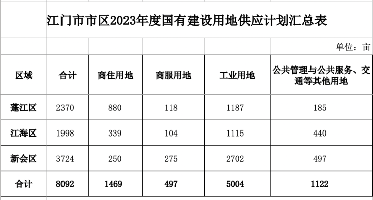 根据《公告》,江门市区2023年度国有建设用地计划供应总量为8092亩。2023年度国有建设用地供应总量中,商住用地1469亩,商服用地497亩,工业用地5004亩,公共管理与公共服务设施、交通等其他用地1122亩。