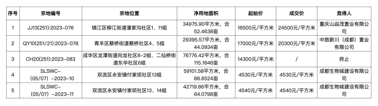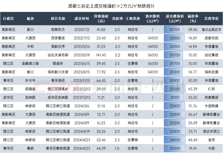 4月23日另一宗溢价出让的地块位于青羊区蔡桥街道蔡桥社区4、5组,该44亩地块起始楼面价17000元/平方米,容积率1.8,占地面积2.94万平方米,规划建面5.3万平方米,该地块经过34轮竞价,由中旅新川(成都)置业有限公司以楼面价20300元/平方米竞得,溢价率19.4%。
