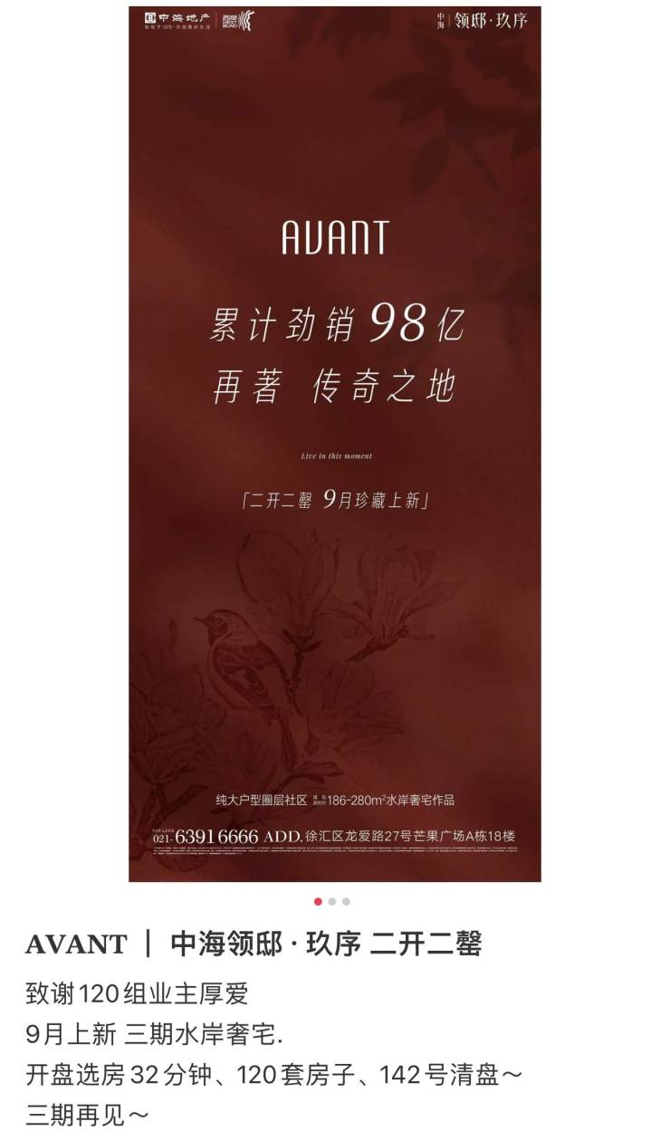 8月29日,位于徐汇滨江的中海领邸·玖序二期迎来开盘。据项目置业顾问发布的二期现场情况,“开盘选房32分钟、120套房子、142号清盘”,实现二开二罄。
