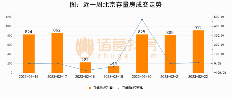 从存量房来看,2023年02月22日北京存量房单日成交912套,比昨日增加103套,环比上涨12.7%。从近一周存量房成交来看,北京存量房日均成交套数为656套,其中02月22日成交量最高为912套,02月22日单日成交912套,高于近一周平均水平39%。
